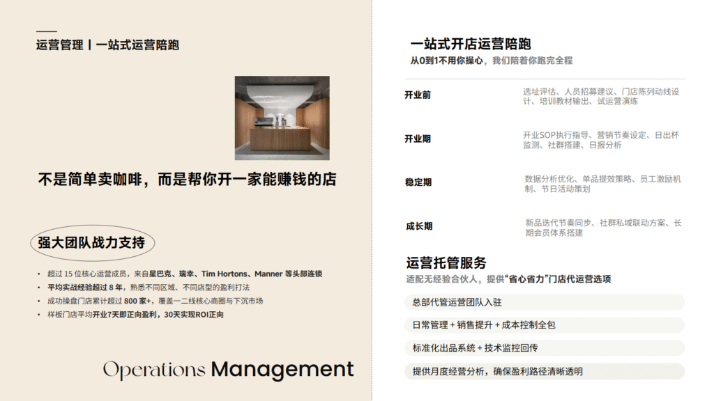 更轻的资金压力、更获利的抽成模式与毛利、更高效的供应链运转,叠加的结果就是加盟商的回本周期明显缩短。DM咖啡销售负责人介绍,咖啡行业的回本周期普遍是24个月,而DM咖啡的模型能做到12–16个月,甚至有门店在8个月内回本。