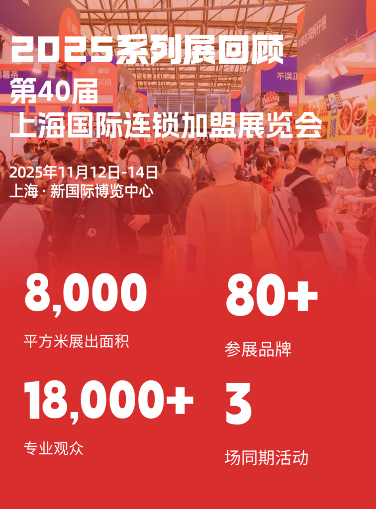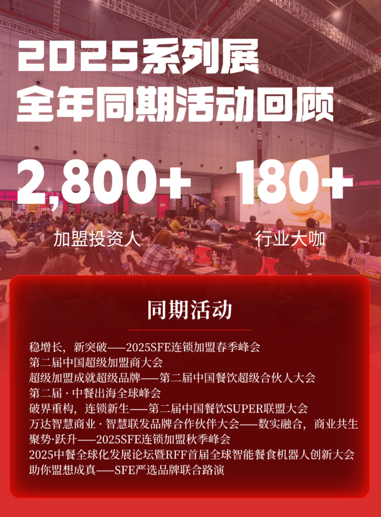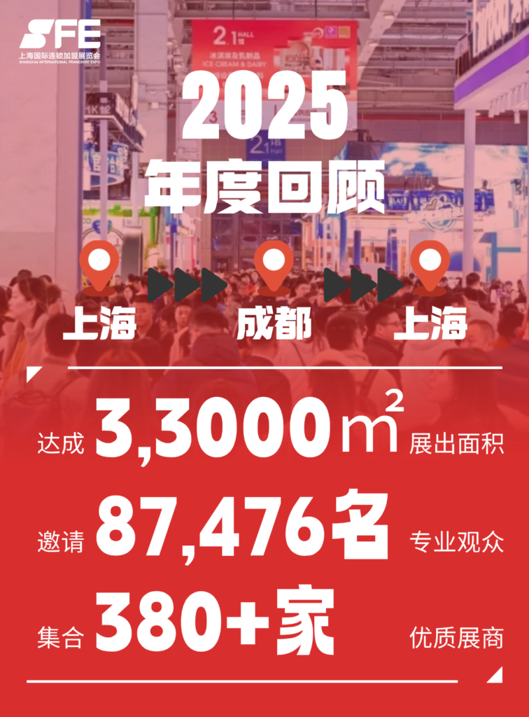 2025年,SFE全年展览面积达到了33,000平方米,吸引了87,476专业观众人次。SFE通过汇聚餐饮、零售、服务、连锁资源四大板块的多家优质品牌,为创业者与投资者提供一站式加盟配对平台。