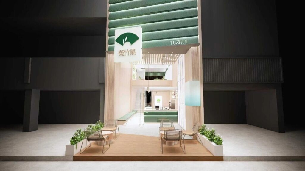 门店风格设计融合东方扇形与 “茶”“兔” 元素,以绿色为主调,呈现简约雅致的视觉风格,线下多款店型精准匹配不同地段客流,统一视觉风格,不同空间体验,每一家菟竹集都好拍又好喝。