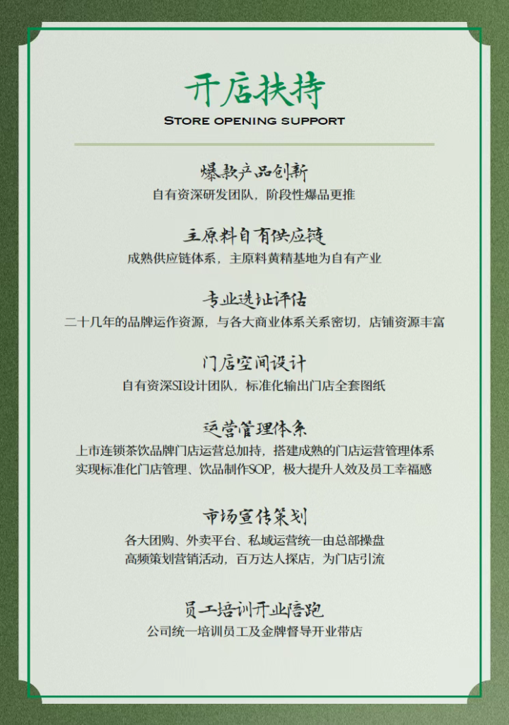 品牌以传承健康茶文化为初心,创新性将拥有两千多年食用历史的传统食材黄精融入现代茶饮,打造全国首创黄精系列奶茶,赋予饮品独特枣香与丰富口感层次,品牌产品涵盖轻乳茶、果茶、纯茶等六大品类,严选优质原料,选用鲜奶、鲜果与原叶茶,喝得到的天然本味。