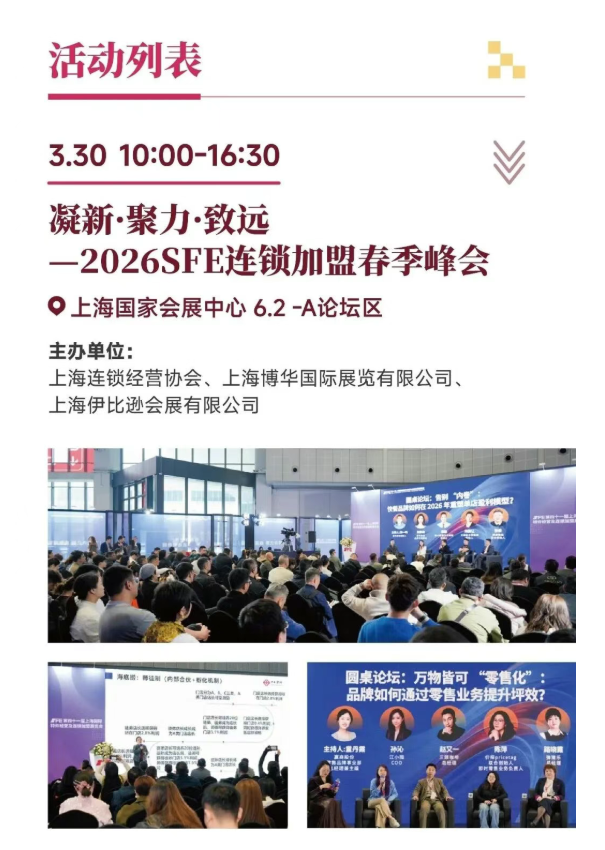 第41届上海春季展的圆满落幕,是2026年SFE系列展会布局的全新起点。依托二十余年行业深耕积淀与本届展会积累的行业口碑,SFE将持续聚焦连锁加盟赛道的发展需求,在2026年下半年带来两场高规格、高价值的行业盛会,持续为品牌方与投资人搭建高效对接、资源共享的核心平台,赋能中国连锁加盟行业的全域发展与价值升级。